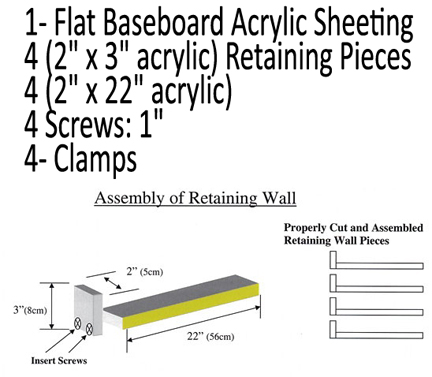 To accommodate our model, we have constructed retaining walls out of ˝" (1.3 cm) thick acrylic strips. We selected acrylic because most mold rubbers release easily from acrylic. Wood can also be used. Four pieces measuring 2" x 3" (5 cm x 7.6 cm) were cut for the shorter side of the retaining wall and four 2" x 22" (5 cm x 56 cm) pieces were cut for the longer side of the retaining