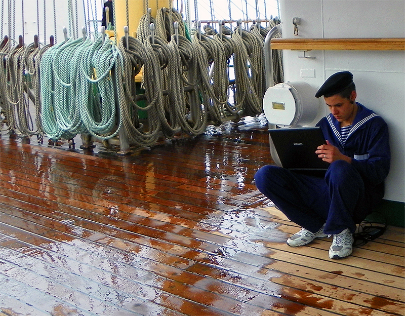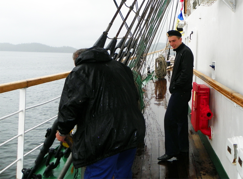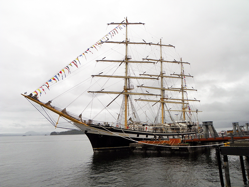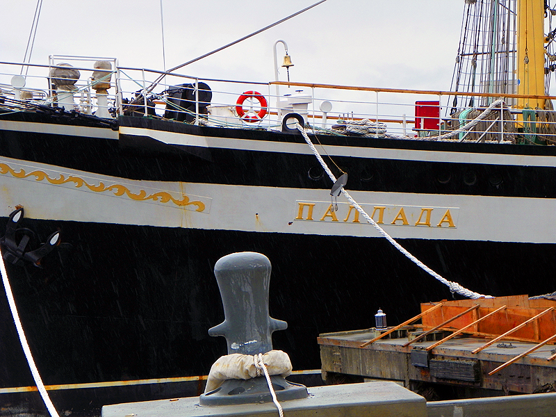 Pallada is the fifth ship of the Dar Mlodziezy-class built in Poland during the 1980’s. Unlike her white- hulled sisters, Pallada has a black hull with false gunports and resembles the great Russian Barque Kruzenshtern. She is named for the Greek goddess Pallas Athena. She is owned by Dalryba, a conglomerate of fishing companies, and offers sail training to foreign marine-college cadets. Pallada sails with a compliment of 143 cadets and a permanent crew of 56 officers, teachers, and professionals.